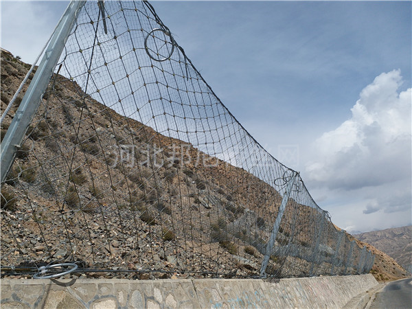 被動邊坡防護網由鋼絲繩網或環(huán)形網(需攔截小塊落石時附加一層鐵絲格柵),固定系統(錨桿、攔錨繩、基座和支撐繩)、減壓環(huán)和鋼柱四個主要部分構成。鋼柱和鋼絲繩網連接組合構成一個整體,對所防護的區(qū)域形成面防護,從而阻止崩塌巖石土體的下墜,起到邊坡防護作用。