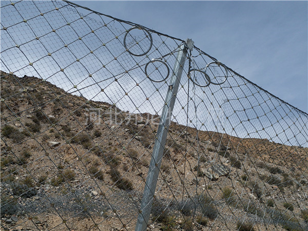 材質:鋼絲繩網、支撐繩和減壓環(huán)構造:由鋼絲繩網或環(huán)形網(需攔截小塊落石時附加一層鐵絲格柵)、固定系統(錨桿、攔錨繩、基座和支撐繩)、減壓環(huán)和鋼柱四個主要部分構成。